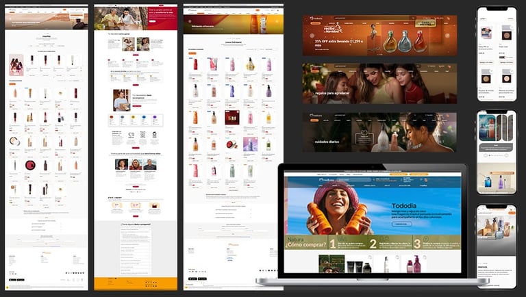 Nota: Debido a las directrices contractuales, no tengo permiso para mostrar interfaces internas o prototipos directamente en mi portafolio. Sin embargo, aquí hay una muestra del portal público de Natura, libre de cualquier información confidencial y fácil de encontrar en Internet.