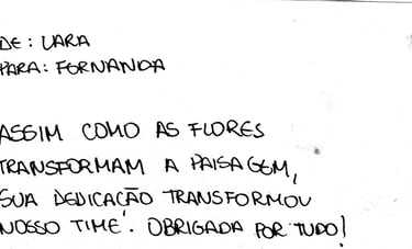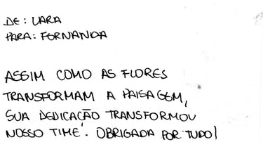 Ao término do projeto, houve um breve reconhecimento do meu trabalho na squad pelos resultados alcançados. Em um cartão desenhado e escrito à mão, pela Design Lead Natura, mostra o quanto a empresa realmente preza pelas pessoas, sejam elas consultoras de beleza, funcionários internos e terceirizados. Isso mostra uma conexão verdadeiramente humana e respeitosa com o próximo, se tornando modelo para qualquer outra equipe de qualquer segmento.
